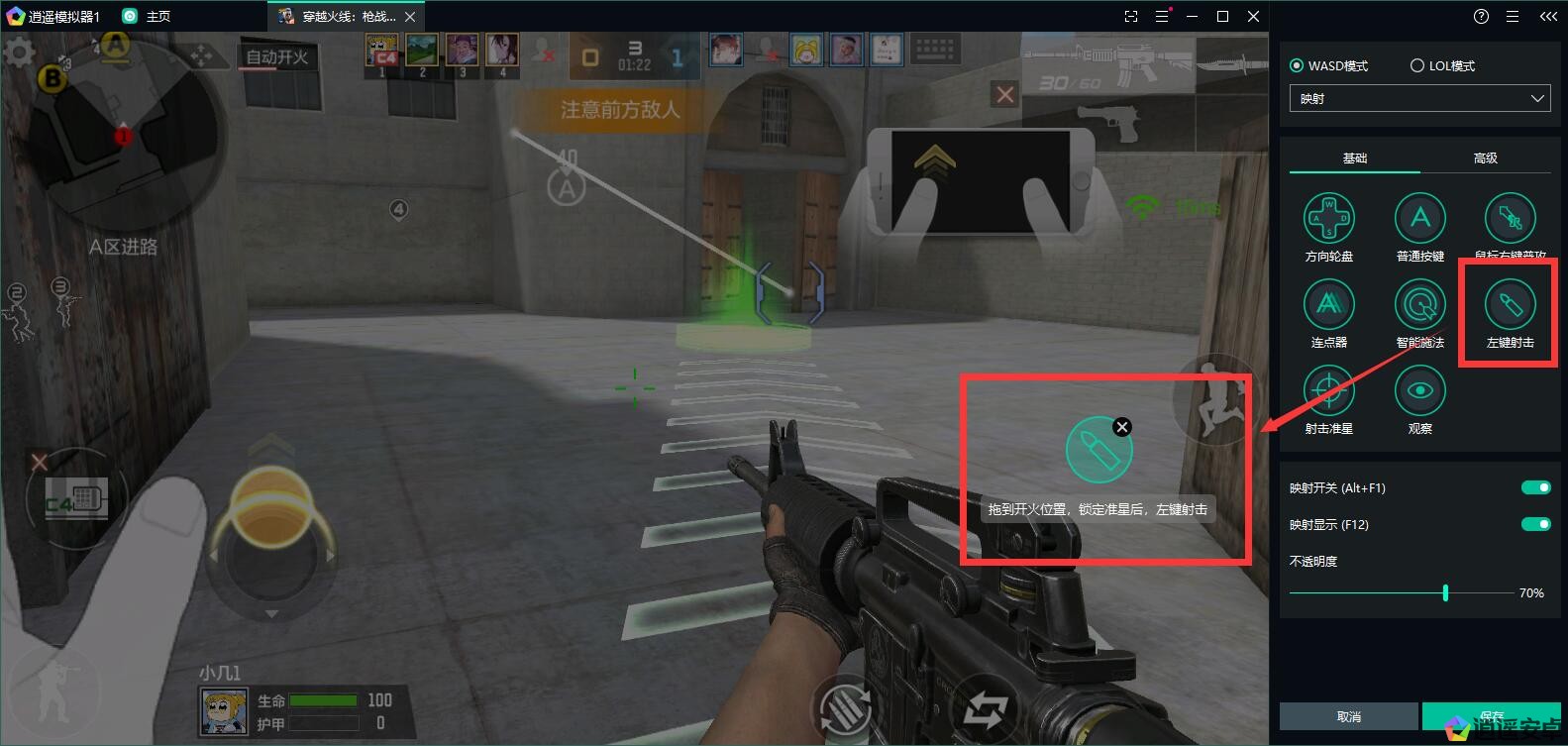 作為FPS的靈魂,射擊是必不可少的按鍵,把左鍵射擊拖拽到游戲?qū)?yīng)位置,按下鼠標(biāo)左鍵之后即可射擊敵人。