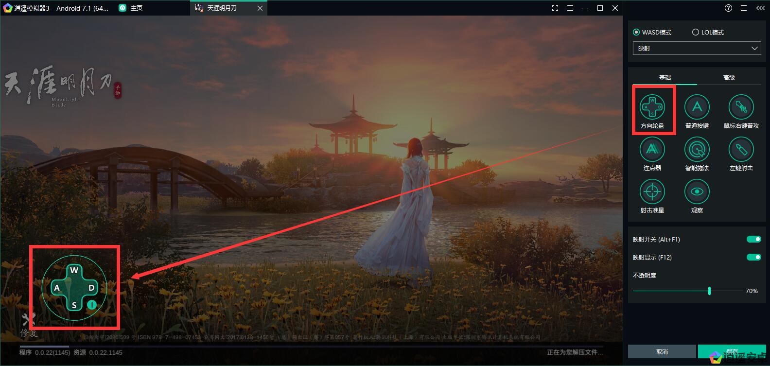 把方向輪盤拖拽到游戲界面的人物移動輪盤處,按W/A/S/D控制人物前后左右移動。(也可以自己更改鍵位設置)。