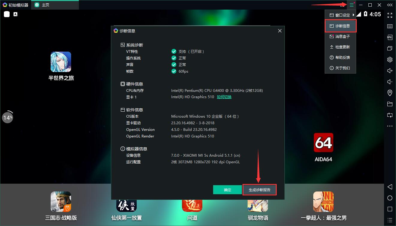 點擊模擬器菜單欄,選擇診斷信息–生成診斷報告–前往保存路徑查看報告并發(fā)送給官方診斷。