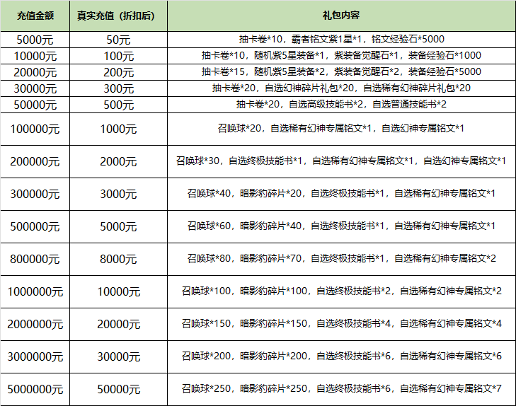 活動(dòng)期間內(nèi)累計(jì)充值達(dá)到以下金額,即可領(lǐng)取禮包獎(jiǎng)勵(lì)