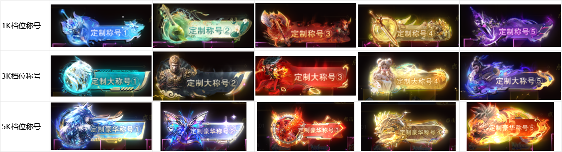 2. 提供模板任選,內(nèi)容可游戲內(nèi)自定義,文案限制6個(gè)字內(nèi),同檔位不能申請(qǐng)重復(fù)模版,稱號(hào)定制內(nèi)容不能有辱罵敏感詞等,若有發(fā)現(xiàn)將回收處理。