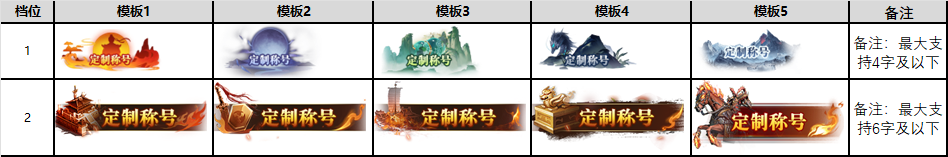 2. 提供對(duì)應(yīng)檔位的5個(gè)模板任選,內(nèi)容可游戲內(nèi)自定義,同檔位不能申請(qǐng)重復(fù)模版,稱號(hào)定制內(nèi)容不能有辱罵敏感詞等,若有發(fā)現(xiàn)將回收處理。