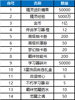 冠名禮包:5系5星精靈自選包*3、高級抽卡券*100、祈愿券*100