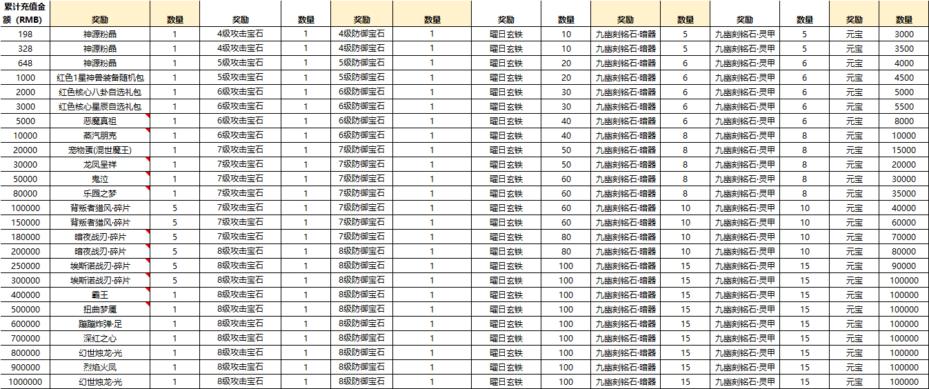 2000A:6級高級防御寶石自選*1、極品培養(yǎng)丹隨機(jī)禮包*1、紅色1星神獸裝備隨機(jī)包*1、曜日玄鐵禮盒*1、神源粉晶*1、召喚令*4*、綁定仙玉*800、元寶*5000、高級天神元魄*4、初級天神元魄*240、煉魂靈玉*40
