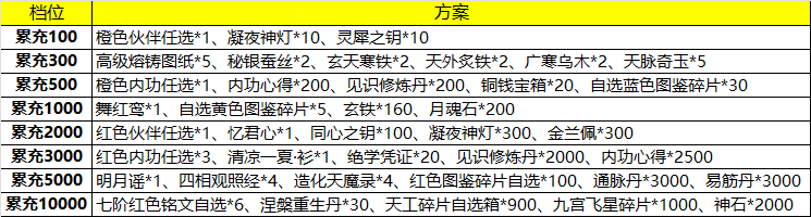 單日累充1w:指定紅伙伴碎片*100、宗師修行碎片自選箱*30