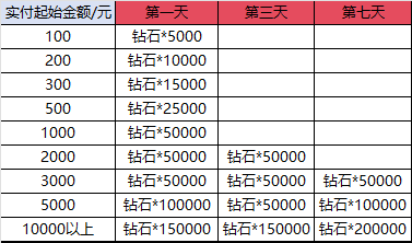 發(fā)放形式:聯(lián)系客服申請發(fā)放。例:老游戲充值實付100元,在本游戲?qū)嵏?000元,可在第一天申請鉆石*50000,第三天申請鉆石*50000