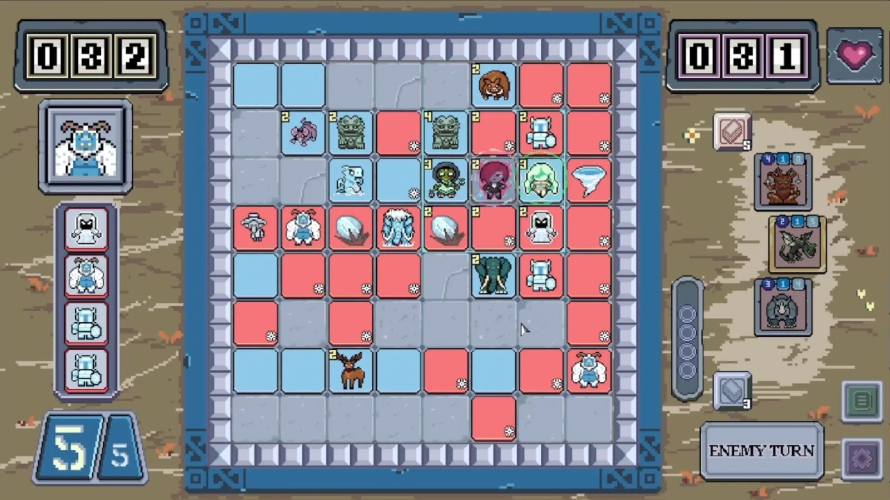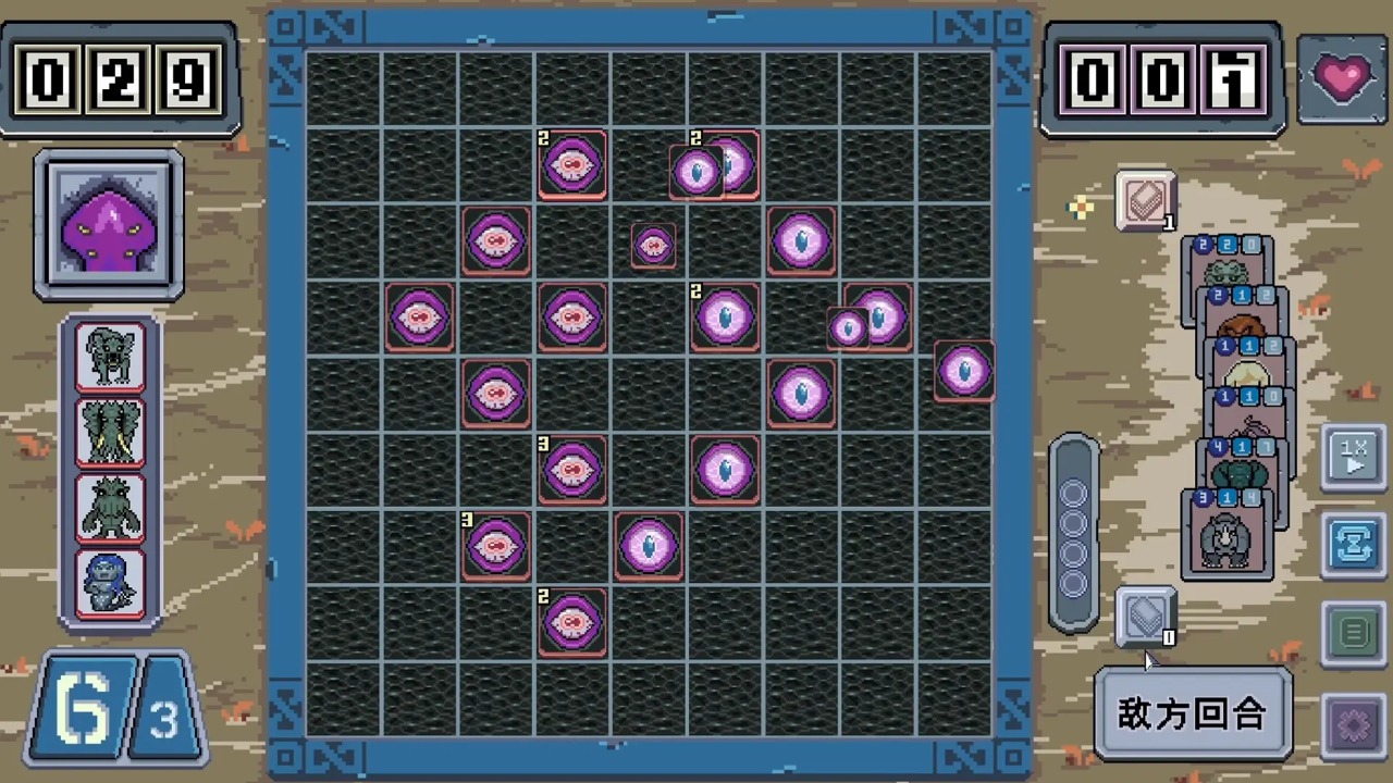 在單局中,敵人和你會在回合內(nèi)依次將魔物磚塊打出在棋盤上。小心選擇你的策略,嘗試占有更多的地塊以獲得更多的分?jǐn)?shù)。游戲結(jié)束時(shí)分?jǐn)?shù)更高的一方將獲得勝利!